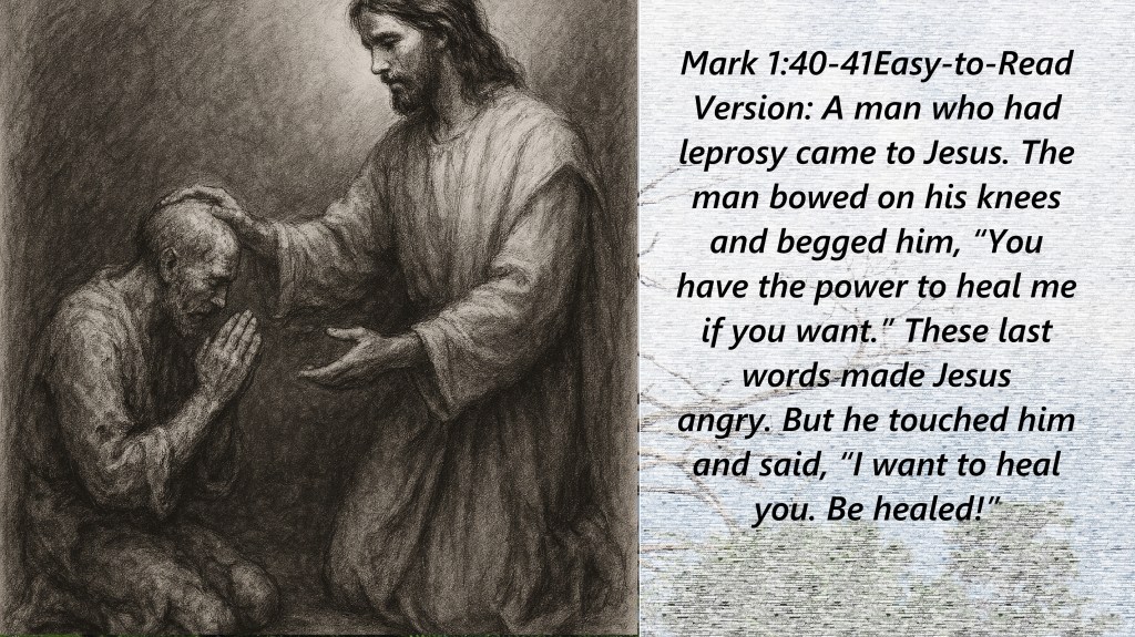 Mark 1:40-41Easy-to-Read Version: A man who had leprosy came to Jesus. The man bowed on his knees and begged him, “You have the power to heal me if you want.” These last words made Jesus angry. But he touched him and said, “I want to heal you. Be healed!”