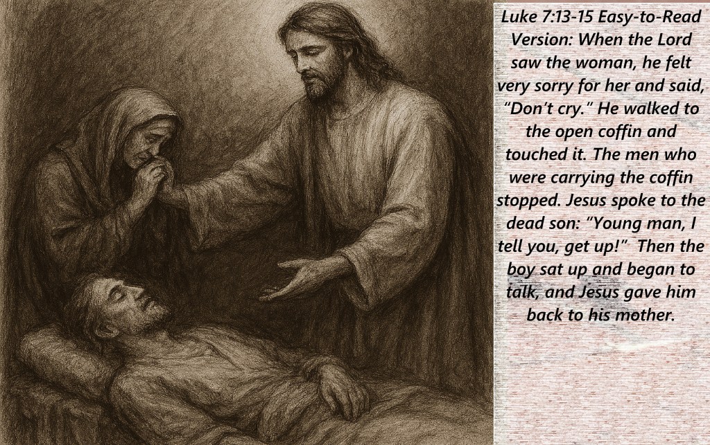 Luke 7:13-15 Easy-to-Read Version: When the Lord saw the woman, he felt very sorry for her and said, “Don’t cry.” He walked to the open coffin and touched it. The men who were carrying the coffin stopped. Jesus spoke to the dead son: “Young man, I tell you, get up!” Then the boy sat up and began to talk, and Jesus gave him back to his mother.