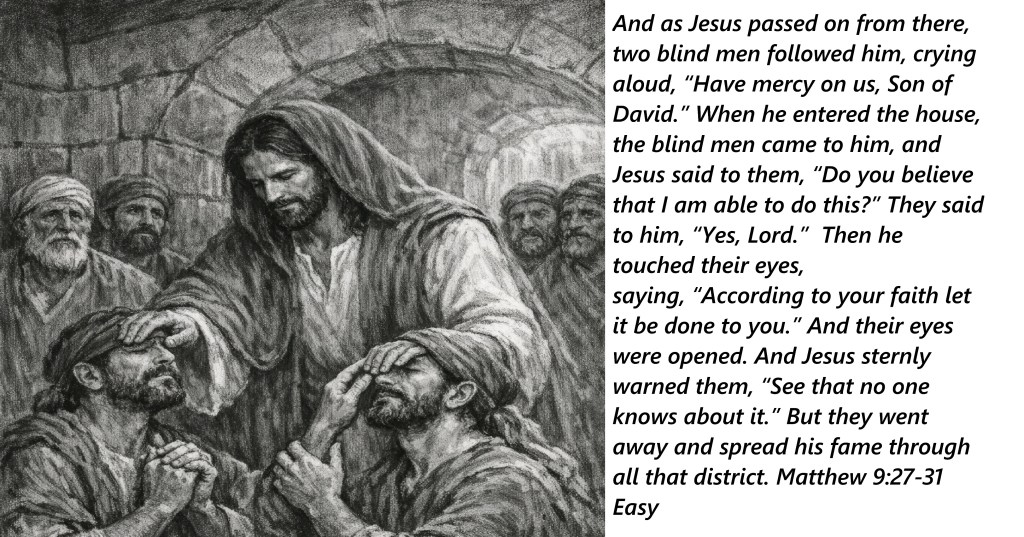 And as Jesus passed on from there, two blind men followed him, crying aloud, “Have mercy on us, Son of David.” When he entered the house, the blind men came to him, and Jesus said to them, “Do you believe that I am able to do this?” They said to him, “Yes, Lord.” Then he touched their eyes, saying, “According to your faith let it be done to you.” And their eyes were opened. And Jesus sternly warned them, “See that no one knows about it.” But they went away and spread his fame through all that district. Matthew 9:27-31 Easy