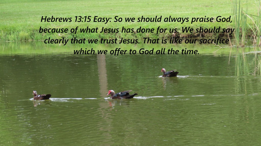 Hebrews 13:15 Easy: So we should always praise God, because of what Jesus has done for us. We should say clearly that we trust Jesus. That is like our sacrifice which we offer to God all the time.